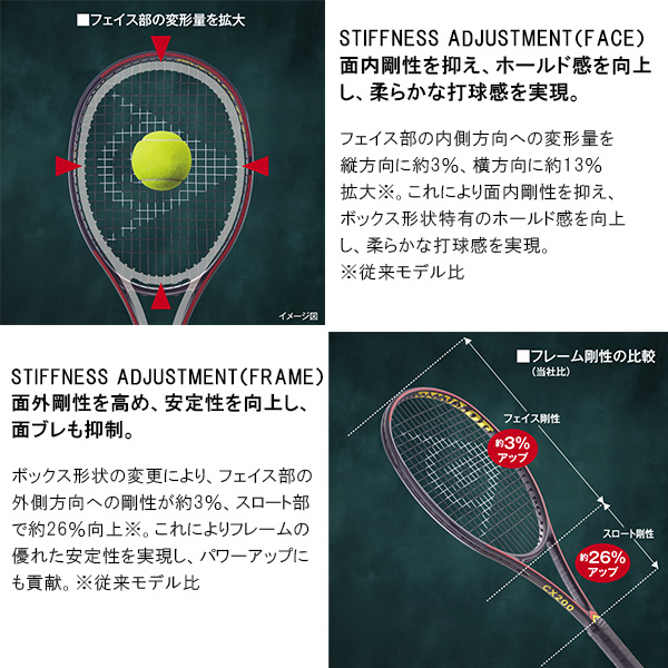 特徴 | パワフルでコントロールに優れた黒の「CX 400 TOUR」限定モデル。 パワーとコントロールを同時に求め、スピンも重視するプレーヤーに。 パワーとスピン性能を高めた100平方インチのボックス形状フレームを採用。 「CX400」よりもフレーム厚をやや薄くし,(24→23mm)、フレックスも柔らかく設定。 「CX200」と「CX400」の中間的なスペックで、ホールド感に優れ、パワーとコントロールを同時に求めるプレーヤーに。 「CX」シリーズの限定デザインはブラックをベースに、1980年代に著名なプロ |