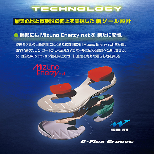 | テクノロジー | 【MIZUNO WAVE】 クッション性と安定性を両立する、ミズノシューズの基幹機能。 【MIZUNO ENERZY nxt】 MIZUNO ENERZYフォームより柔らかく、反発性が高く、軽量なミッドソール素材。 【Pownce】 軽さと反発性を兼ね備えたミッドソール素材。 【U4icX】 軟らかさを追求したミッドソール素材。 【D-Flex Groove】 スムーズな蹴りだしをサポートするソール構造。 【足入れ革命3.0】 テニス独自の動きやプレーヤーの足型を見つめなおし、テニスに必要なフィッティングを追求。足入れ革命2.0から踵のフィッティングを向上、サイズ感のずれを解消しアップデートした設計。 【3D-SOLID】 アッパーに搭載された樹脂補強構造。耐久性とサポート製に優れる。 |