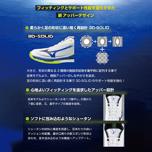 | テクノロジー | 【MIZUNO WAVE】 クッション性と安定性を両立する、ミズノシューズの基幹機能。 【MIZUNO ENERZY nxt】 MIZUNO ENERZYフォームより柔らかく、反発性が高く、軽量なミッドソール素材。 【Pownce】 軽さと反発性を兼ね備えたミッドソール素材。 【D-Flex Groove】 スムーズな蹴りだしをサポートするソール構造。 【足入れ革命3.0】 テニス独自の動きやプレーヤーの足型を見つめなおし、テニスに必要なフィッティングを追求。足入れ革命2.0から踵のフィッティングを向上、サイズ感のずれを解消しアップデートした設計。 【3D-SOLID】 アッパーに搭載された樹脂補強構造。耐久性とサポート製に優れる。 【U4icX】 軟らかさを追求したミッドソール素材。 |