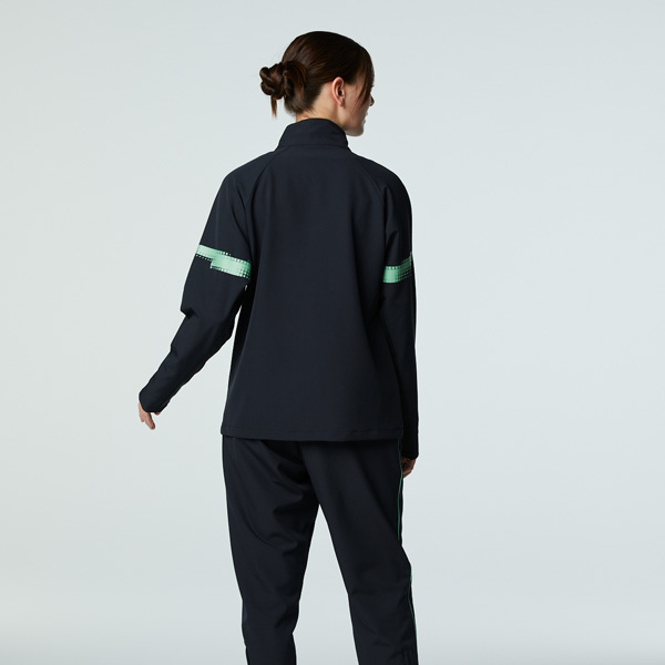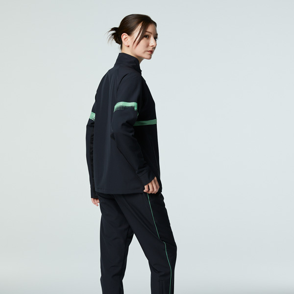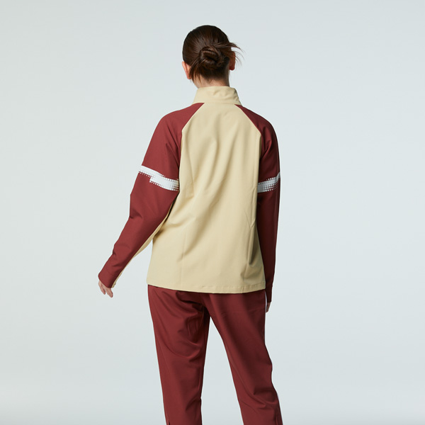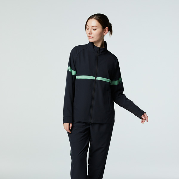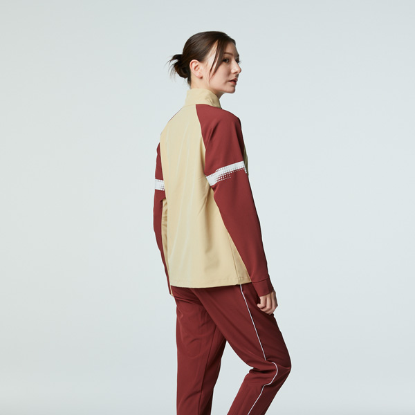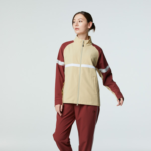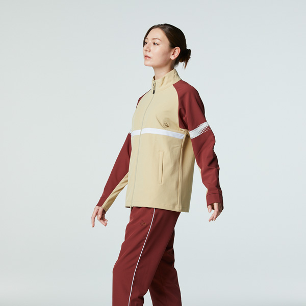 | 特徴 | 両袖から正面の切り替えが印象的。 ストレッチ素材を使用したトラックジャケット。 |