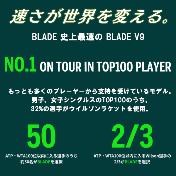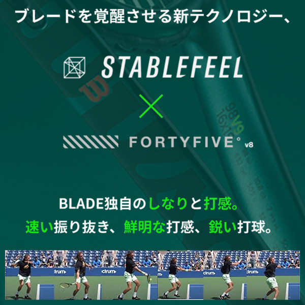 | 特徴 | V9ATP/WTAツアーで最も多くの選手に選ばれているBLADEシリーズの第9世代。 安定性とパワー・コントロール性能を向上するために、カーボンテクノロジー"STABLE FEEL"を新たに考案。 この"STABLE FEEL"を採用することで、繊細な感覚を持つトップ選手が求めるBLADE独特のしなりと柔らかな打感を維持することを実現。 |