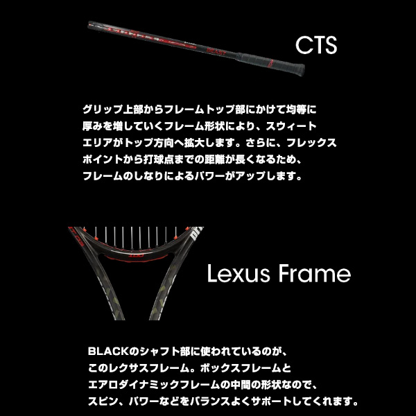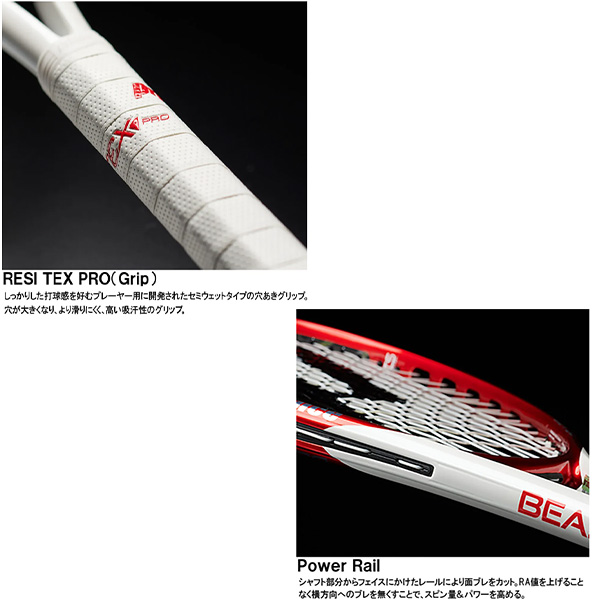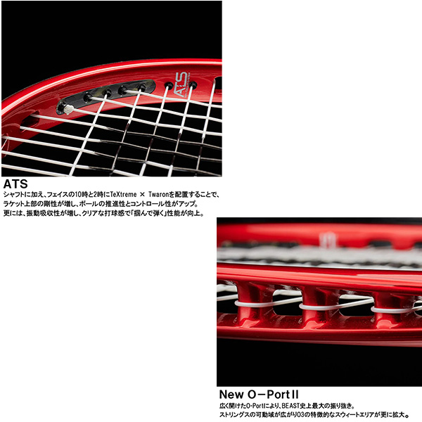 | 特徴 | シャフト部分からフェイスにかけたレールにより面ブレをカット。 RA値を上げることなく横方向へのブレを無くすことで、スピン量&パワーを高める。 NEW Oポート2+トップ部27mmでフェイス上部はボックス形状、+CTS構造のNEWフレームがハイパワー、ハイスピンを実現。 ATS搭載で面剛性も高く、厚く当てて、ハードヒットできる最新テクノロジーラケット。 トップ部はボックス形状でハイパワーラケットでありながら安心して厚く当ててハードヒットできる最新テクノロジーラケット。 スマートテニスセンサー装着可能モデル |