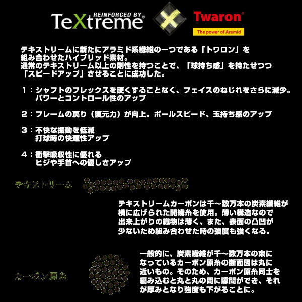 | テクノロジー | 【テキストリーム×トワロンテクノ口ジー】 第二世代テキストリームカーボン。 テキストリームに新たにアラミド系繊維の一つである「トワロン」を組み合わせたハイブリッド素材。 通常のテキストリーム以上の剛性を持つことで、「球持ち感」を持たせつつ「スピードアップ」させることに成功した。 【ATS】 シャフトに加え、フェイスの10時と2時にTeXtreme×Twaronを配置することで、ラケット上部の剛性が増し、ボールの推進性とコントロール性がアップ。 さらには、振動吸収性が増し、クリアな打球感で「掴んで弾く」性能が向上。 |