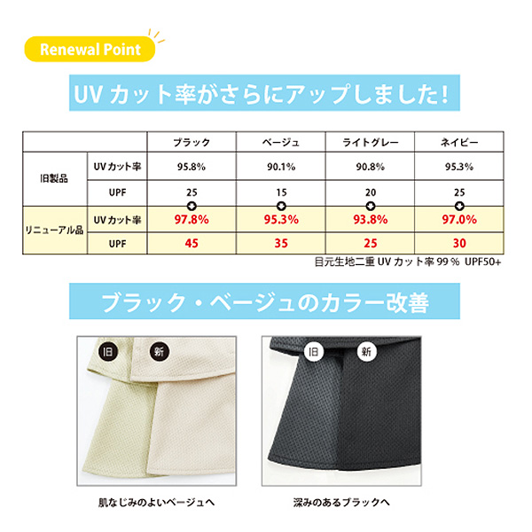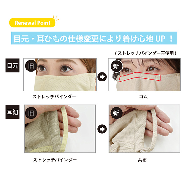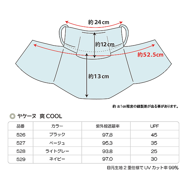 | テクノロジー | 目元生地二重UVカット率99% UPF50+ 【UVカット】 紫外線遮蔽率93.8%~97.8%、UPF25~45 【伸縮性能】 日本製ニット生地は良く伸び破れにくい 【吸汗速乾】 汗の吸水性が良く、すぐに乾きます 【高通気性】 通気性が高いので蒸れにくく快適 【国内生地】 ヤケーヌは日本製生地使って日系ベトナム工場で縫製しています。 |