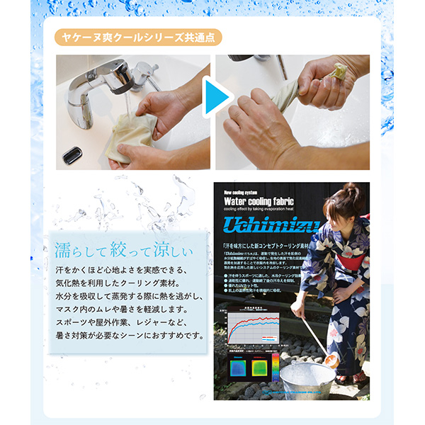 | 特徴 | 水に濡らして絞って涼しい!暑さ対策も同時にできる夏の人気アイテム! 爽クール(リニューアル) スナップボタン留め 形態安定テープ入り UVカット率がさらにアップしました! 【商品タイプ】 ・スナップボタン式留め具 ・鼻芯(形態安定テープ)あり ・耳カバーなし ・気化熱の働きを活用した爽クール。 濡らして使うことでより涼しく快適に使用いただけます。 濡らしたときに服が濡れないよう丈が短めなのもポイントです。 【使用目的】 ・ヤケーヌフェイスカバーは、お顔の紫外線対策、日焼け予防を目的としたフェイスマスク型商品です。 顔の目元から鼻・頬・口・あご・首・首後ろからデコルテにかけてをUVカットすることで日焼けや赤くなるのを防ぎます。 英語表記:suntan、sunburn、sunscreen、sun protection 【特徴】 1、長く装着しても"息苦しくない" 2、ペットボトルなど、"着けたまま水分補給できる" 3、"メガネがくもりにくい"(サングラス、ゴーグルもOK) 4、上下2部式オリジナル構造になっているのは当店だけ 5、耳紐の長さが調節出来、リングは本体内に収納できる 【大きさ寸法】 ・フリーサイズ ・下布の中央縦寸は約13cm前後、衣服が濡れにくいように少し短め ・首後ろに行くほど少しずつ短くなる仕様になっています。 ※耳紐の長さを調節出来るので、男性も女性も使っていただけます。 耳までカバーしたい方向けに爽クール耳カバー付もオススメ! →ヤケーヌ爽クール耳カバー付 【機能】 ・オリジナル構造で息苦しくない。 ・息が下に抜けやすいのでメガネがくもらない。 ・大きな開口部から着けたまま水分補充できます。 ・耳ひもは長さ調節出来るので痛くなりません。 ・打ち水効果でより涼しく快適に。 ・日焼け止めと組み合わせて使うことでより効果を発揮します。 【使い道使用シーン】 男性、女性からおじいちゃん、おばあちゃんや有名芸能人まで、こんなシーンでご使用いただいています。 屋外作業:農業、農作業、漁業、畑、庭作業、ガーデニング、草苅り スポーツ:ウォーキング、お散歩、ジョギング、ゴルフ、テニス、ランニング、マラソン、サイクリング、セーリング、スポーツ観戦、ジム、乗馬 スキンケア:小顔効果、エイジングケア、スキンケア、美容、しみ対策、すっぴん隠し 趣味:釣り、海、プール、野球観戦、サッカー観戦、音楽フェス、野外ライブ、登山、ハイキング、トレッキング、山登り、アウトドア、サバイバルゲーム、サバゲ、キャンプ、ゆるキャン、ツーリング、ボルダリング、ドライブ その他:通勤、通学、車の運転、送迎、送り迎え、犬の散歩、感染予防、飛沫防止、花粉症対策、洗濯干し、物干し、洗車、紫外線アレルギー、術後ケア、酒さ対策、肌荒れ対策 【お手入れ】 ・洗濯ネットに入れて洗濯機で繰り返し洗えます。 【プレゼントギフト包装】 【サービス停止中】 当店では簡易ラッピングサービスを実施中。 1注文につき1包装に限り、商品価格を隠し商品を包装してご希望のお届け先に発送できます。 こんな用途にも:プレゼント、贈り物、誕生日祝い、御礼、ノベルティ、記念品、粗品、お返し、景品、プチギフト、夏ギフト、父の日、母の日、バレンタイン、敬老の日、勤労感謝の日、残暑見舞い、入学、進学、就職、春夏秋冬喜んで頂けます。 この商品はお母さん、義母、おばあちゃん、祖母、女友達、上司、後輩、レディースなど女性から、お父さん、義父、おじいちゃん、祖父、メンズなど男性まで、20代、30代、40代、50代、60代以上と幅広くに贈って喜ばれます。 【ネット販売上のご注意】 ★お使いのモニターや商品撮影時の照明、太陽光の環境により実際のカラーとは異なって見える場合がございますので予めご了承ください。 ★ご注文はお昼12時が〆切りです。 12時を過ぎたご注文は翌日注文と同じ扱いになります。 ★即日発送をご希望の場合は、宅配便を選択し受取日を翌日指定してください。(対応エリアのみ) ★メール便(ポスト便)はご注文順に1~3日以内に出荷しています。 備考欄にコメントがあると確認のため出荷が+1日遅くなる場合がありますのでご了承ください。 ★商品発送手続き後のご注文出荷キャンセルは、出荷前でもお断り致します。 この場合は、商品到着後にお客様理由での返品キャンセル手続きとなりますので予めご了承ください。 ★マスクという商品の特性上、商品パッケージ開封後の返品や交換はお断りしております。 【企画販売元】 UVカットフェイスカバー ヤケーヌは、愛知県西尾市にある株式会社丸福繊維が独自開発し特許を取得した2010年から販売しているオリジナル商品です。 ※素材そのものが紫外線カットするので洗濯してもUVカット率は変わりません。 |
